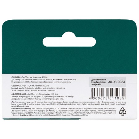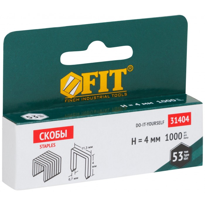 Скобы для степлера закалённые прямоугольные 11,3 мм х 0,7 мм (узкие тип 53) 4 мм, 1000 шт. (31404)