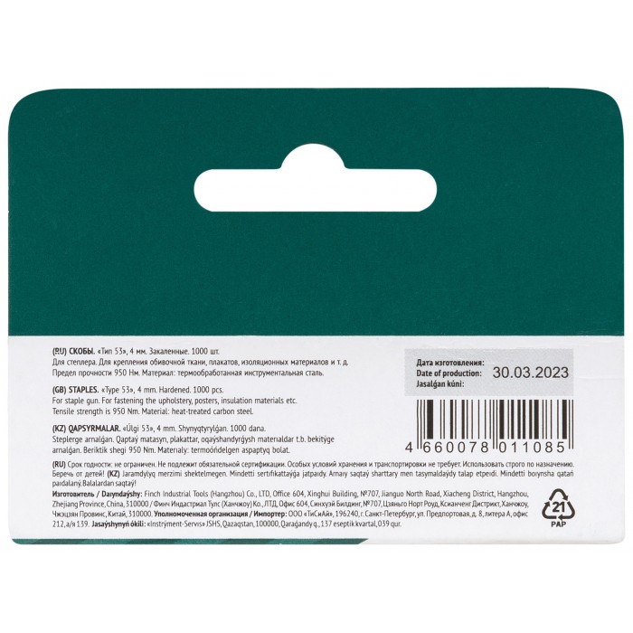 «Тип 53». Узкие, прямоугольные. Для степлеров 32081, 32084, 32086, 32095, 32104, 32114, 32120, 32123, 32135, 32145. Упаковка: коробка с подвесом.