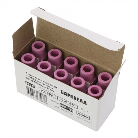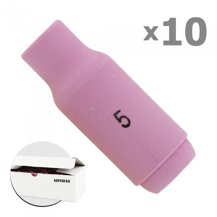 Керамическое сопло БАРСВЕЛД №5 ф 8 мм используется в сварочных горелках при ручной аргонодуговой сварке методом TIG. Керамика высокого качества гарантирует долгий срок службы сопла, несмотря на постоянное взаимодействие с раскаленным металлом. Подходит для горелок серии SR 17, 18 и 26.