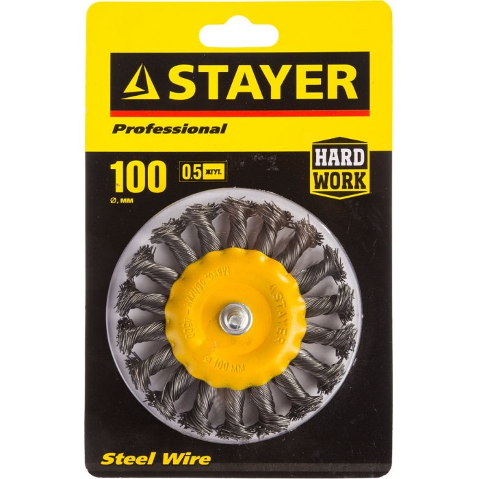 Все изготавливаемые щетки STAYER серии PROFESSIONAL соответствуют действующим стандартам качества и обеспечивают безопасную работу в указанном диапазоне оборотов. Применяются на дрели для удаления краски, ржавчины, заусенцев, нагара, окалины с поверхностей изделий из стали и цветных металлов, а также для зачистки сварных швов.