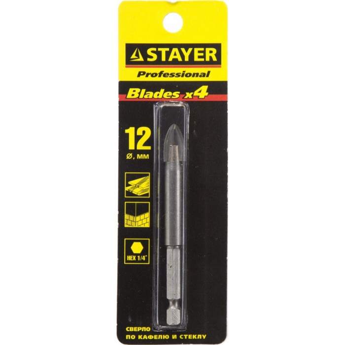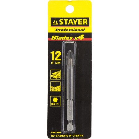 Сверло по стеклу и кафелю 12 мм, 4х кромка, HEX 1/4 STAYER 2985-12_z01