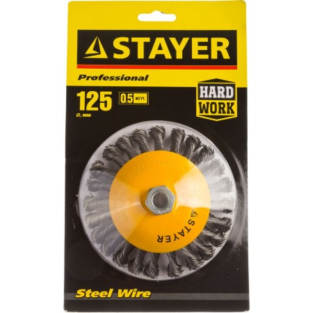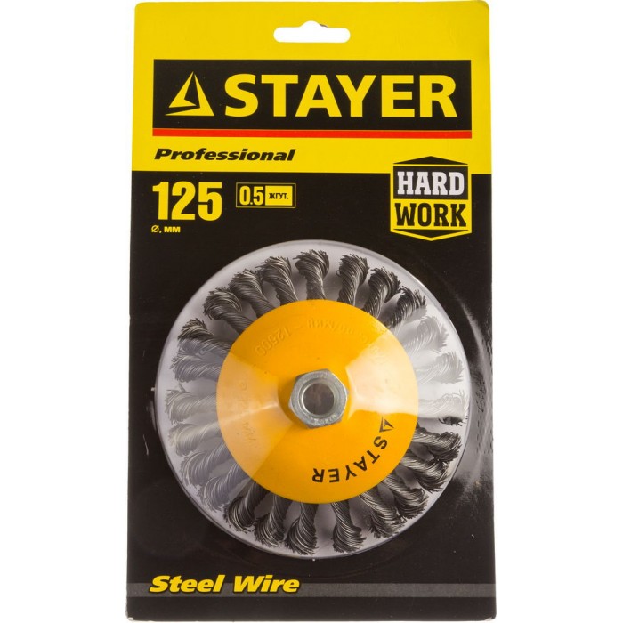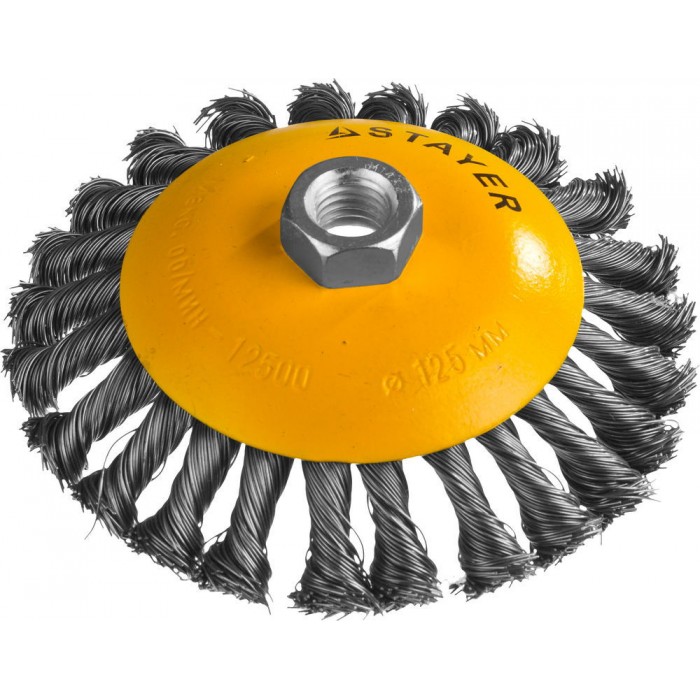 Щетка-крацовка коническая для УШМ 125 мм, жгутированная стальная проволока 0.5 мм Professional STAYER 35135-125