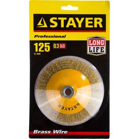 Щетка-крацовка коническая для УШМ 125 мм, витая стальная латунированная проволока 0.3 мм Professional STAYER 35133-125