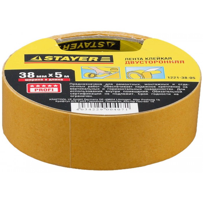 Лента клейкая двухсторонняя 38 мм, 5 м, на полипропиленовой основе STAYER 1221-38-05