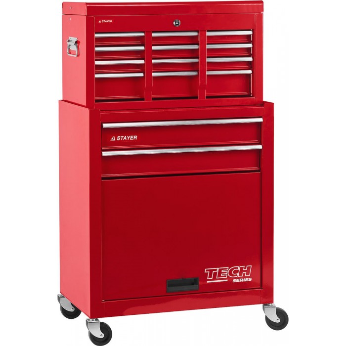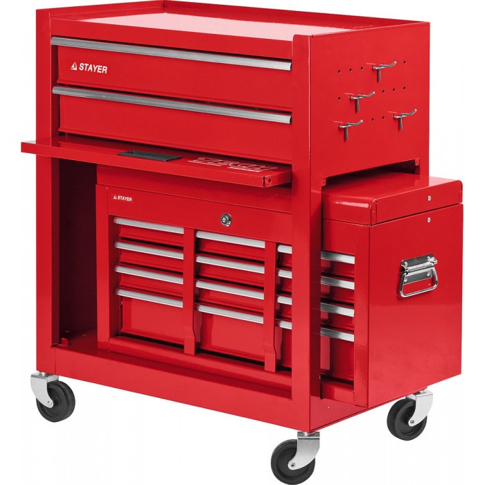 Профессиональная тележка STAYER позволит комфортно организовать рабочее место с легким доступом ко всем инструментам. При необходимости можно транспортировать его, а так же использовать ключи для безопасности