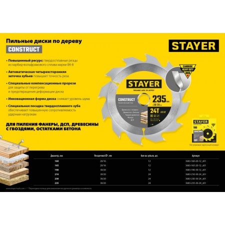 Диск пильный по дереву Construct, 165 x 20/16 мм, 12Т, технический рез STAYER 3683-165-20-12_z01