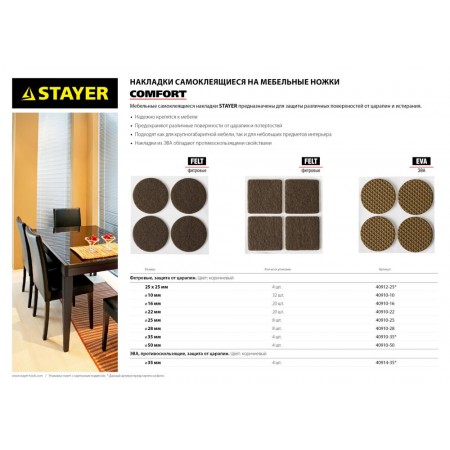Мебельные самоклеящиеся накладки Stayer предназначены для защиты различных поверхностей от царапин и истирания.