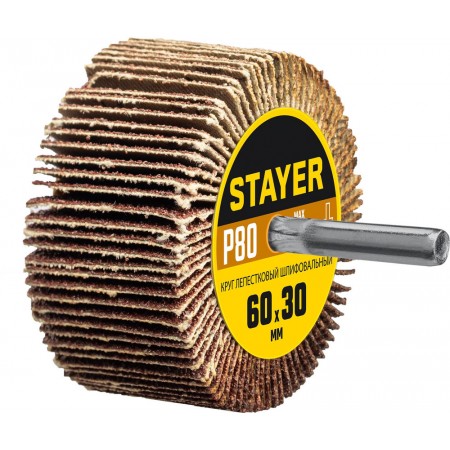 Круг шлифовальный лепестковый d 60 x 30 мм, P80, на шпильке d 6 мм STAYER 36608-080