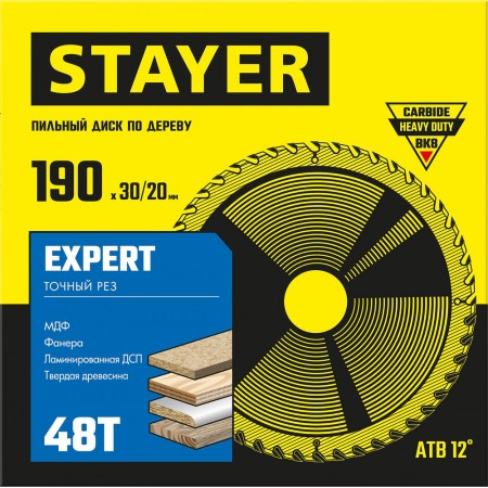 Диск пильный по дереву Expert, 190 x 30/20 мм, 48Т, точный рез STAYER 3682-190-30-48_z01