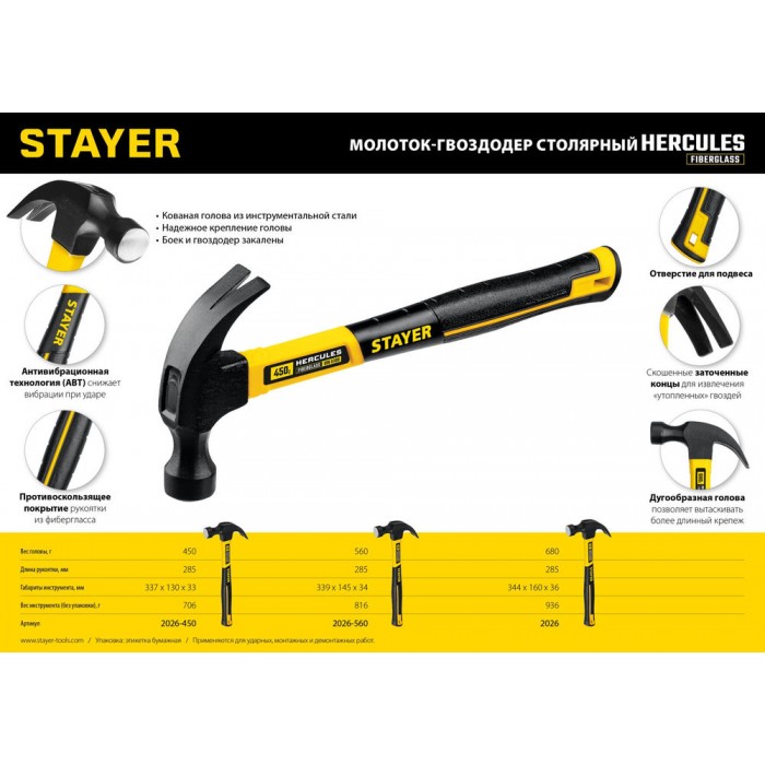 Молоток-гвоздодёр столярный Fiberglass, 680 г, с фиберглассовой рукояткой STAYER Professional 2026_z02
