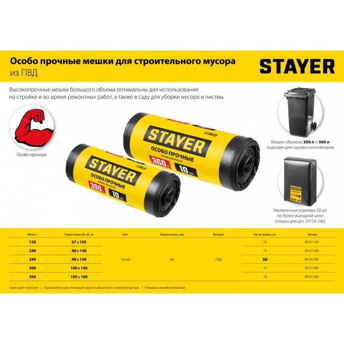 Мусорные мешки STAYER предназначены для сбора тяжелого строительного мусора такого как битый кирпич, штукатурка, куски картона, гипса и т.п. для последующей его утилизации .