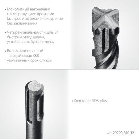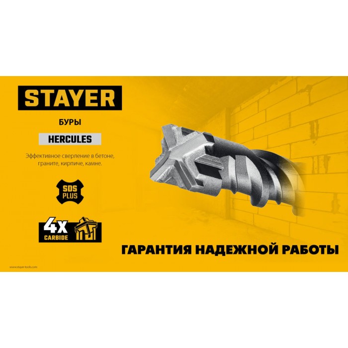 Буры STAYER HERCULES-4Х - надежный инструмент, отвечающий самым высоким требованиям качества и для любой сложности работ. Применяются при сверлении отверстий в бетоне, граните, кирпичной кладке, камне и твердых известняках.