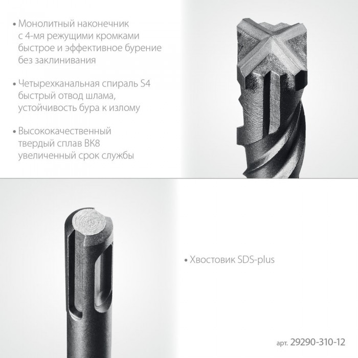 Для ударного сверления отверстий в бетоне, граните, кирпичной кладке, камне и твердых известняках. Используется на легких и средних перфораторах с зажимом SDS-plus.