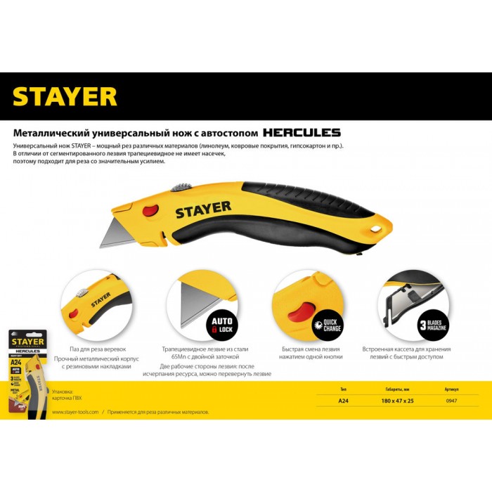 Нож универсальный металлический с трапециевидным лезвием Professional Hercules-A24 STAYER 0947
