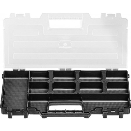 Ящик с встроенным органайзером и съемной полкой позволяет организовать удобное и надежное хранение большого количества инструментов. Широкая алюминиевая рукоятка помогает сместить центр тяжести ящика, если это необходимо