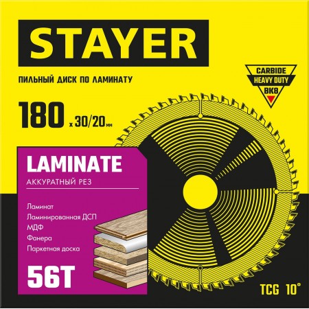 Диск пильный по ламинату Laminate STAYER 180x30/20 мм 56Т аккуратный рез 3684-180-30-56_z01