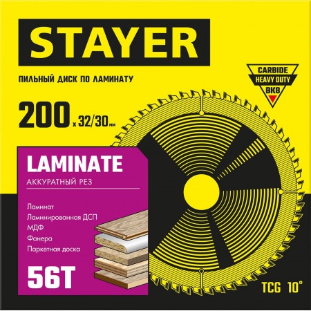 Диск пильный по ламинату Laminate STAYER 200x32/30 мм 56Т аккуратный рез 3684-200-32-56_z01