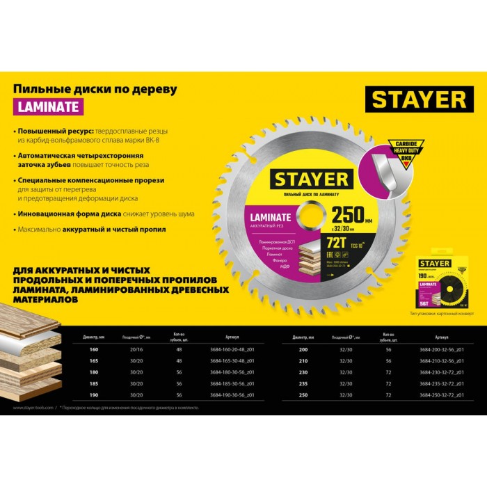 Диск пильный по ламинату Laminate STAYER 210x32/30 мм 56Т аккуратный рез 3684-210-32-56_z01