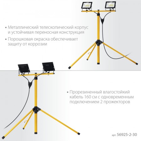 Прожекторы STAYER на штативе - осветительный прибор, состоящий из прочной и устойчивой треноги с двумя прожекторами на основе ярких, высокоэффективных и долговечных источников света. Корпус прожекторов выполнен из алюминиевого сплава литого под давлением, обеспечивающего высокую теплоопередачю. Конструкция прожектора защищена от пыли и влаги (IP65).