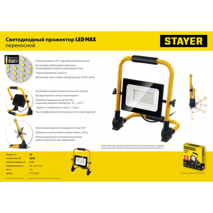 Прожекторы STAYER предназначены для подсветки зданий, сооружений, памятников, рекламных щитов, а также для освещения парковок, стадионов и других объектов. Благодаря ударопрочному корпусу, термостойкому стеклу и высокому классу электрозащиты эти изделия можно использовать на улице в любую погоду. Компактный и прочный алюминиевый корпус. Высококачественный рефлектор.