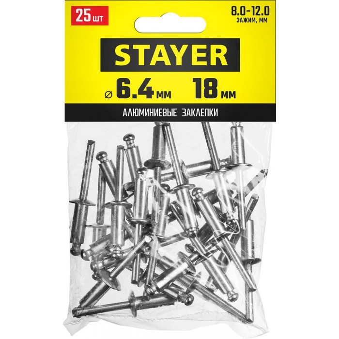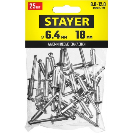 Широкий размерный ряд заклепок STAYER позволяет скреплять листовые материалы разной толщины. Использование вытяжных заклепок при монтаже существенно сокращает время работы. Для установки заклепок требуется заклепочник и доступ с одной стороны скрепляемых материалов.
