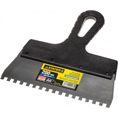 Благодаря зубчатой кромке шпатель идеально подходит для работы со строительными и клеевыми смесями, полотно из нержавеющей стали обеспечивает надежность и долгий срок службы, а удобная пластмассовая рукоятка создает условия для комфортной работы