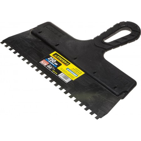 Благодаря зубчатой кромке шпатель идеально подходит для работы со строительными и клеевыми смесями, полотно из нержавеющей стали обеспечивает надежность и долгий срок службы, а удобная пластмассовая рукоятка создает условия для комфортной работы