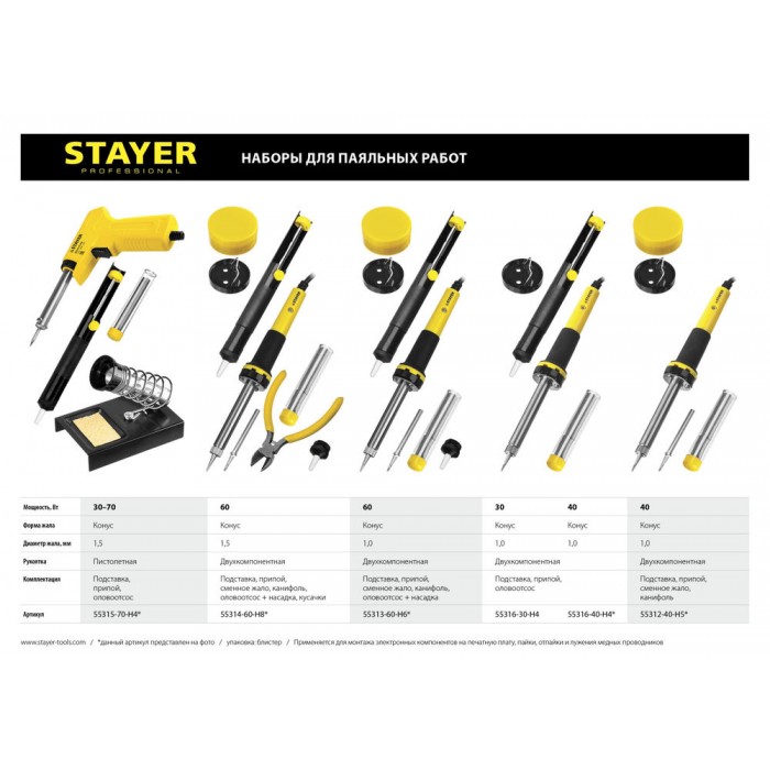 Паяльное оборудование STAYER изготовлено из высококачественных современных материалов. Профессиональный подход и учет всех тенденций развития рынка обеспечивают высокую надежность и длительный срок службы. оборудования.