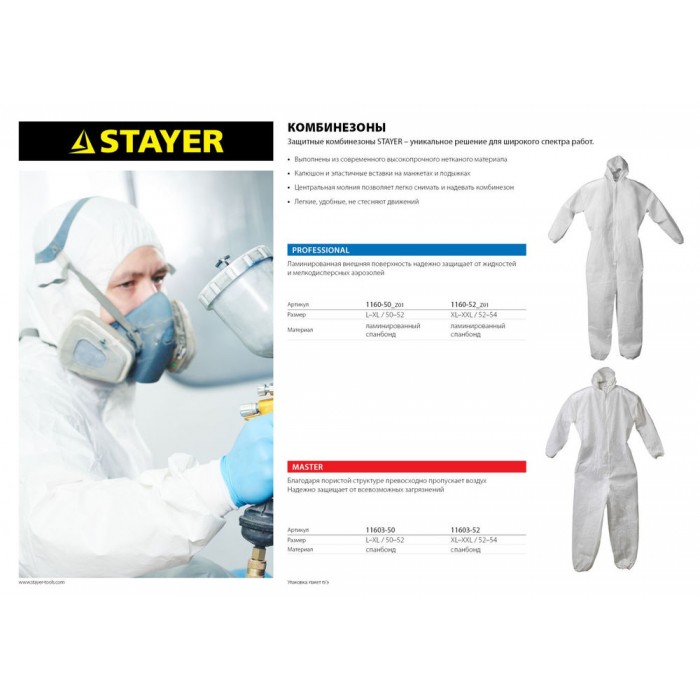Защитные комбинезоны STAYER предназначен для защиты одежды от общих производственных загрязнений и брызг не разъедающих жидкостей.