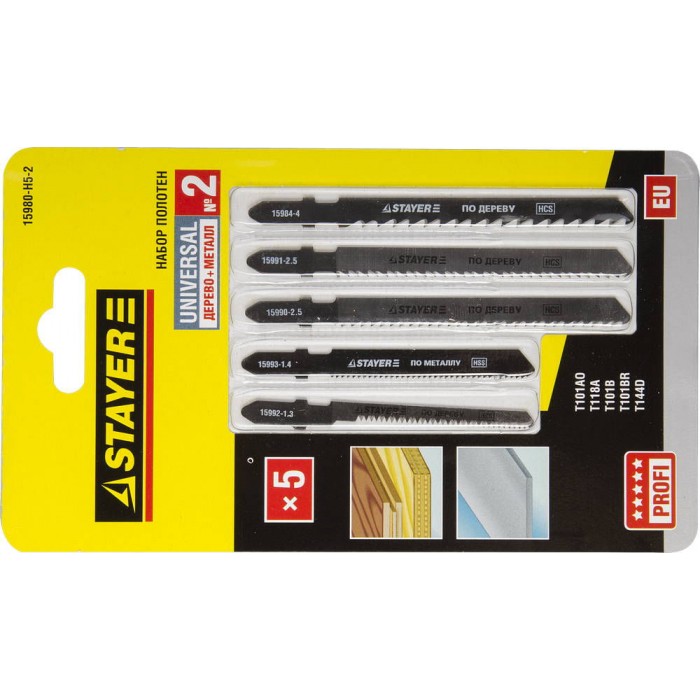 Набор полотен для лобзика T-хвост., по дереву и металлу, 5 шт UNIVERSAL №2 STAYER 15980-H5-2