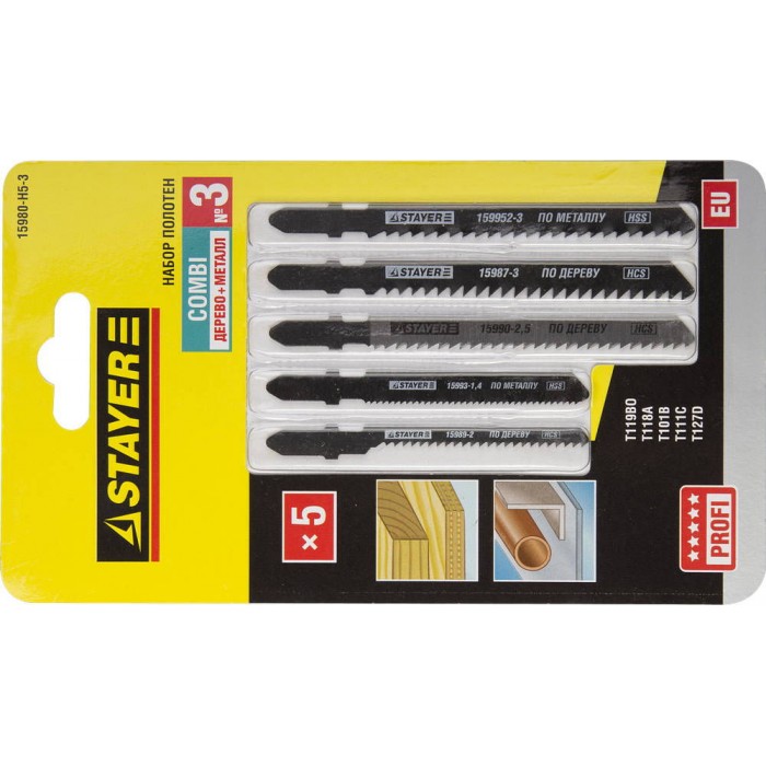 Набор полотен для лобзика T-хвост., по дереву, металлу и пластику, 5 шт COMBI №3 STAYER 15980-H5-3