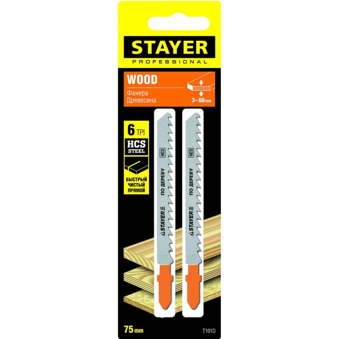 Полотна для лобзика T-хвост., HCS сталь, по дереву/ДСП/ДВП, шаг зуба 4 мм (6TPI), раб. длина 75 мм, 2 шт T101D Professional STAYER 15990-4
