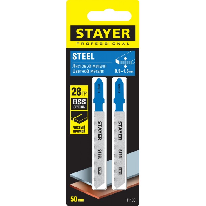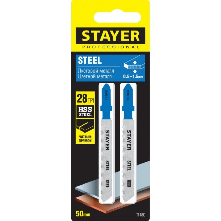 Полотна для лобзика 2 шт, 50 мм / 1.1 мм, T-хвост., HSS сталь, по металлу толщиной 0.5-1.5 мм T118G Professional STAYER 15993-1.1
