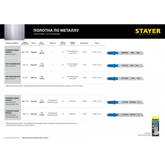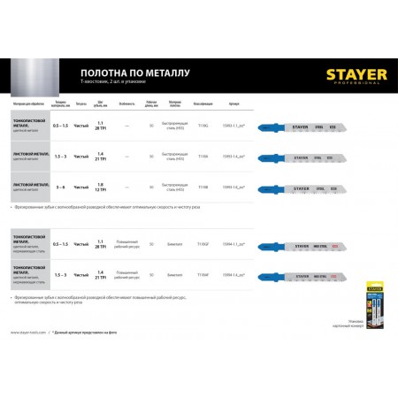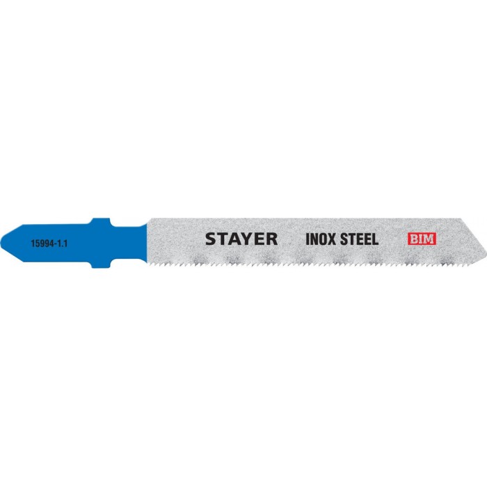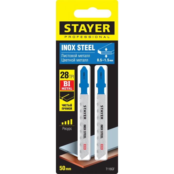 Полотна для лобзика T-хвост., Bi-Metal, по металлу 0.5-1.5 мм, шаг зуба 1.1 мм, раб. длина 50 мм, 2 шт T118GF Professional STAYER 15994-1.1