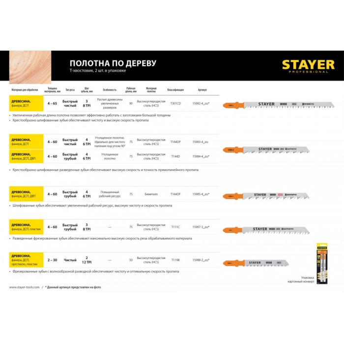 Полотна для лобзика T-хвост., HCS сталь, по дереву/фанере/ДСП, шаг зуба 2 мм (12TPI), раб. длина 50 мм, 2 шт T119B Professional STAYER 15988-2