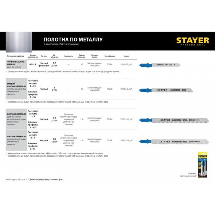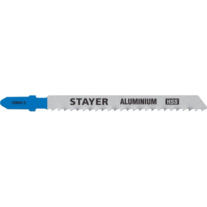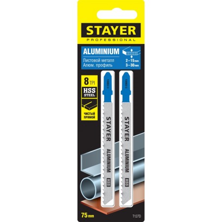 Полотна для лобзика T-хвост., HSS сталь, по мягкому металлу толщиной 2-15 мм, шаг зуба 3 мм (8TPI), раб. длина 75 мм, 2 шт T127D STAYER 159952-3