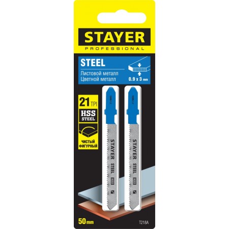 Полотна для лобзика 2 шт, 50 мм / 1.2 мм, T-хвост., HSS сталь, фигурный рез по металлу толщиной 0.9-3 мм T218A STAYER 15995-1.2