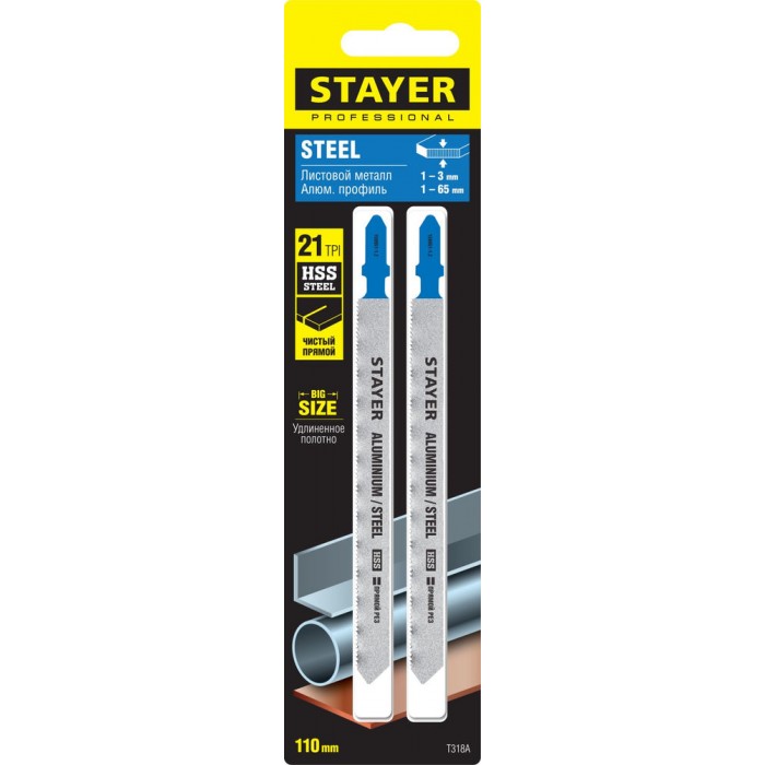 Полотна для лобзика 2 шт, 110 мм / 1.2 мм, T-хвост., HSS сталь, по металлу 1-3 мм, по алюмин. профилям до 65 мм T318A STAYER 159951-1.2