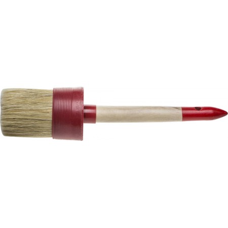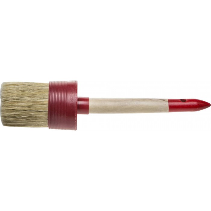 Натуральная щетина обеспечит оптимальное нанесение различных видов ЛКМ, щетина кисти надежно закреплена в пластмассовом корпусе, а наличие удобной деревянной рукоятки обеспечит комфортную работу