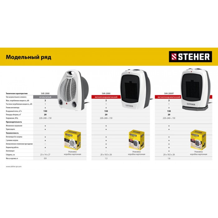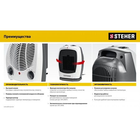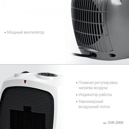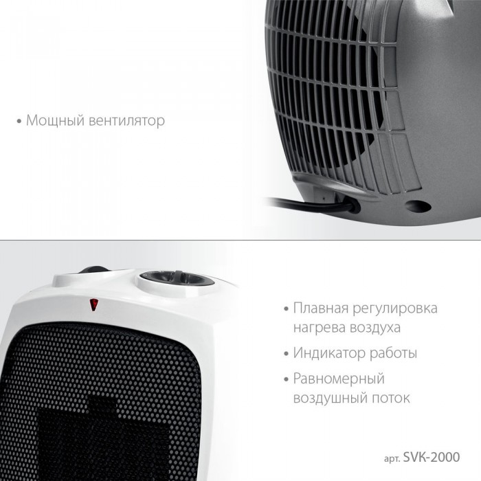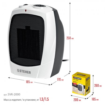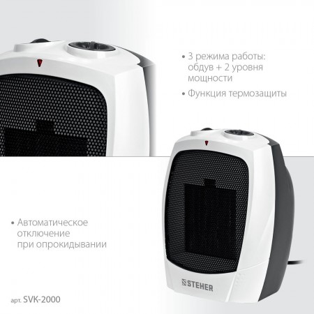 Тепловентилятор STEHER SVK оснащен высокоэффективным металлокерамическим нагревательным элементом 2000 Вт.Мгновенно обогревает помещение площадью до 20 м². Тепловентилятор отличается пониженным уровнем шума в процессе работы, что делает его использование максимально комфортным. Режим вентиляции без обогрева позволяет использовать прибор и летом в качестве обычного вентилятора. Возможность регулирования, как мощности, так и температуры нагрева воздуха позволяет создать наиболее комфортный микроклимат в помещении. Благодаря уникальному авторскому дизайну тепловентилятор станет украшением любого интерьера.