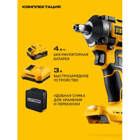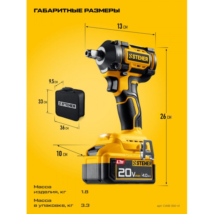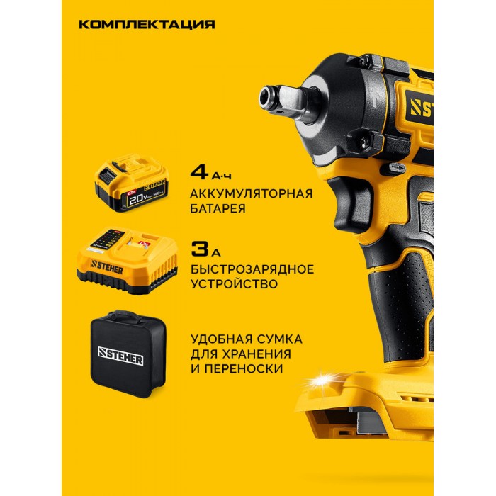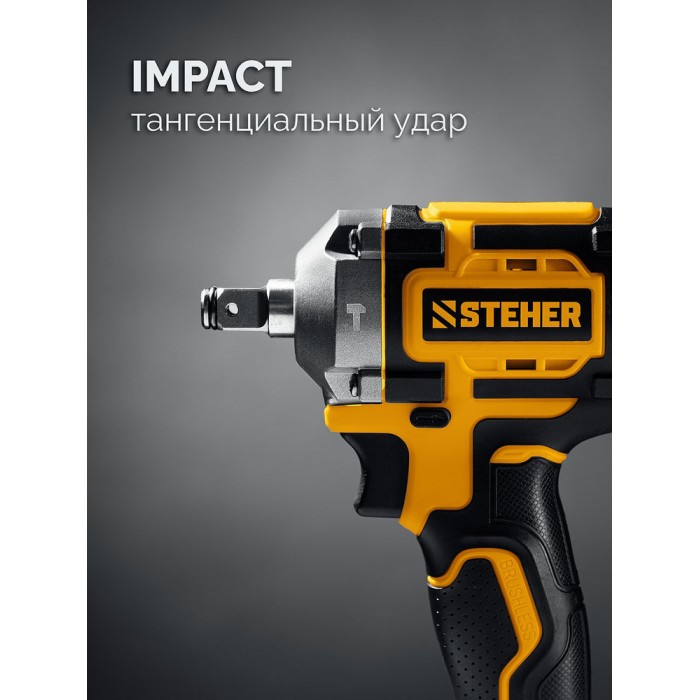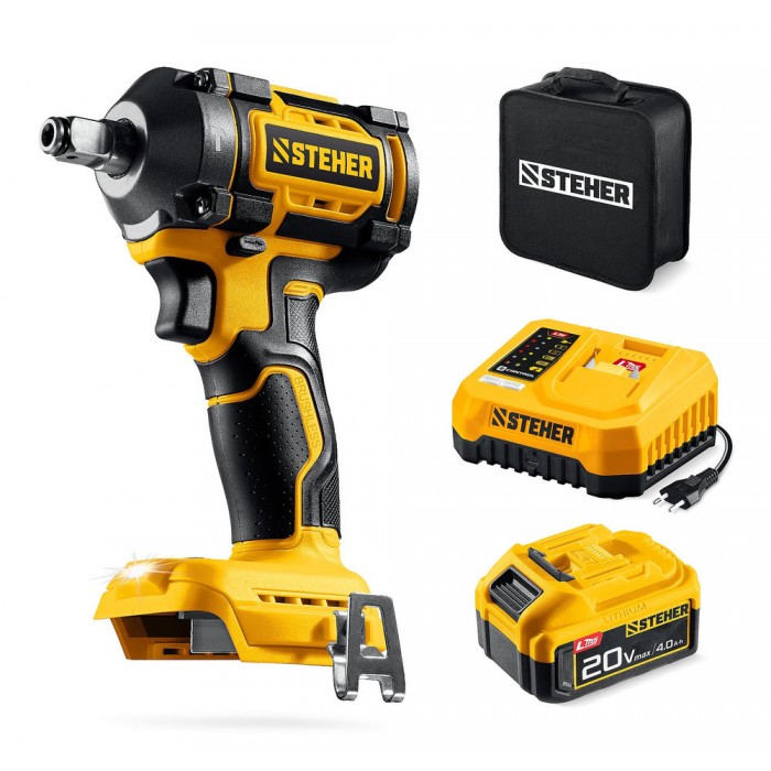 Бесщеточный ударный гайковерт Steher с BRUSHLESS двигателем и максимальным крутящим моментом 350 Н∙м предназначен для фиксации резьбовых соединений размером до М18. Ударная функция с эффективным направлением удара обеспечивает легкое заворачивание без лишней нагрузки на кисть оператора. Имеет современную аккумуляторную систему LMS с 1 АКБ в комлекте, совместимую с одним известным брендом.