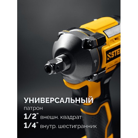 - Универсальный патрон с квадратным хвостовиком 1/2'' и внутренним HEX 1/4'' позволяет устанавливать стандартный сменный инструмент без переходников