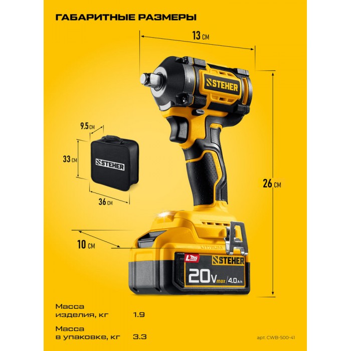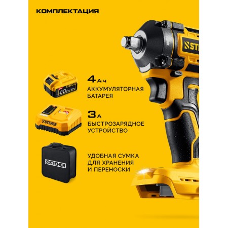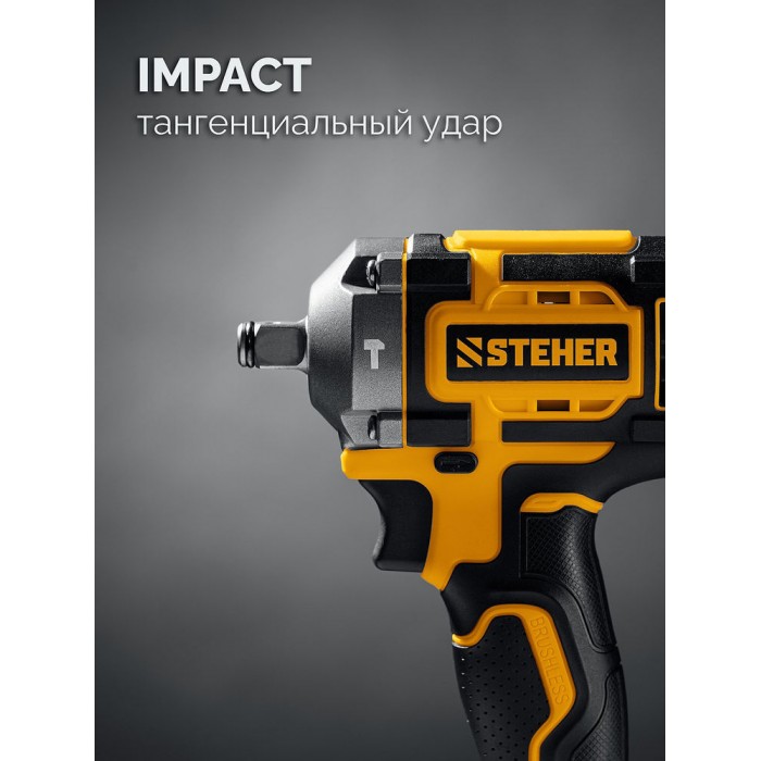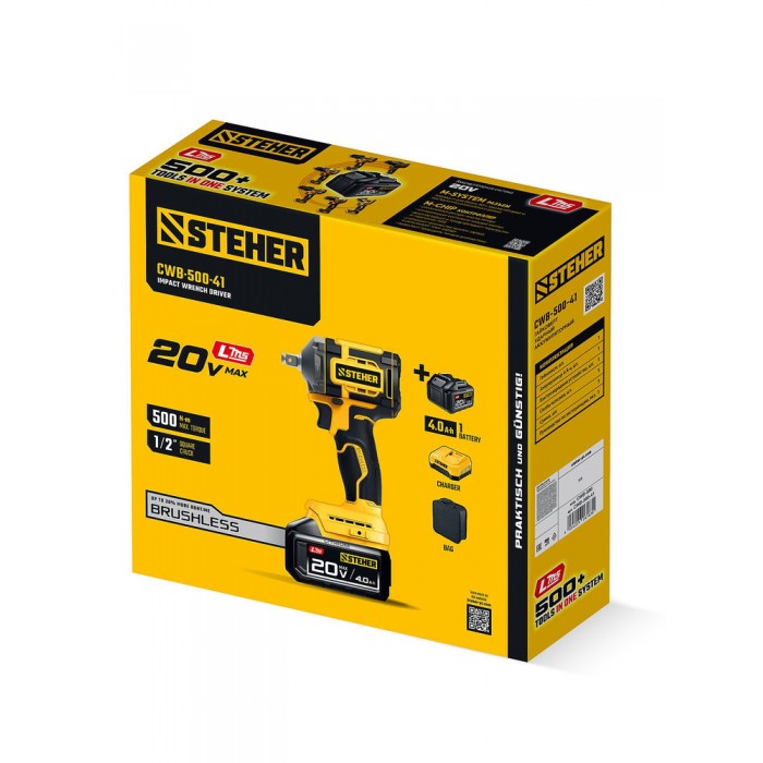 Бесщеточный ударный гайковерт Steher с BRUSHLESS двигателем и максимальным крутящим моментом 500 Н∙м предназначен для фиксации резьбовых соединений размером до М22. Ударная функция с эффективным направлением удара обеспечивает легкое заворачивание без лишней нагрузки на кисть оператора. Имеет современную аккумуляторную систему LMS с 1 АКБ в комлекте, совместимую с одним известным брендом.