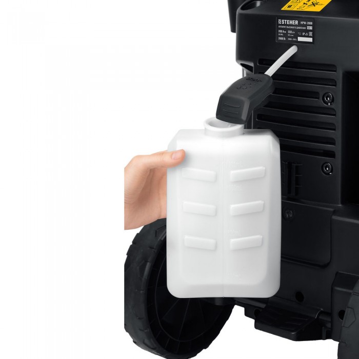 - Сменные быстросъемные насадки с различными углами распыления для формирования струи различного давления, а также нанесения моющего средства: