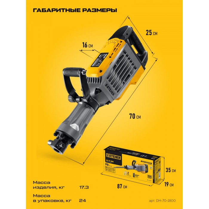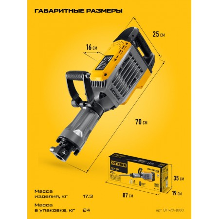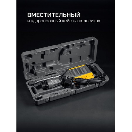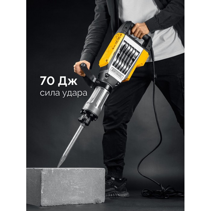 Производительный представитель на рынке инструмента среди моделей с энергией удара 70 Дж. Разрушает конструкции любого типа, за счёт применения своей массы и мощности. Отбойный молоток имеет провод длиной 6 м, надёжный патрон HEX 30 и комплект долот, который поможет Вам сразу приступить к запланированной работе.