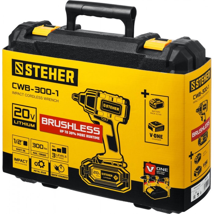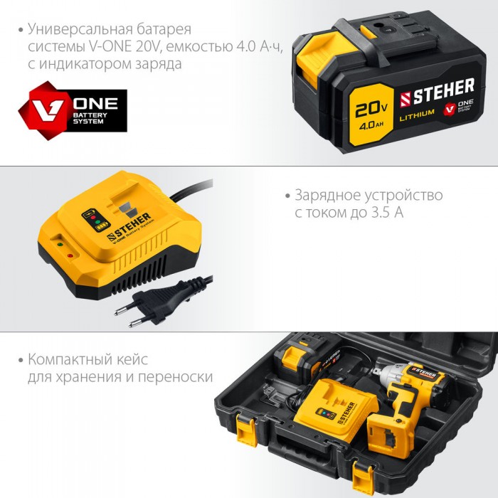 - Аккумулятор универсальной системы Li-Ion V1 20 В с повышенной емкости 4.0 А*ч позволяет инструменту работать дольше и эффективнее