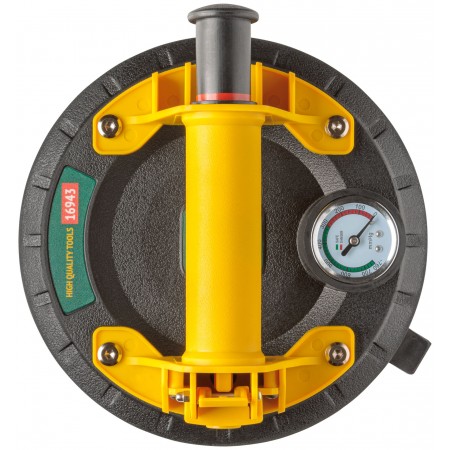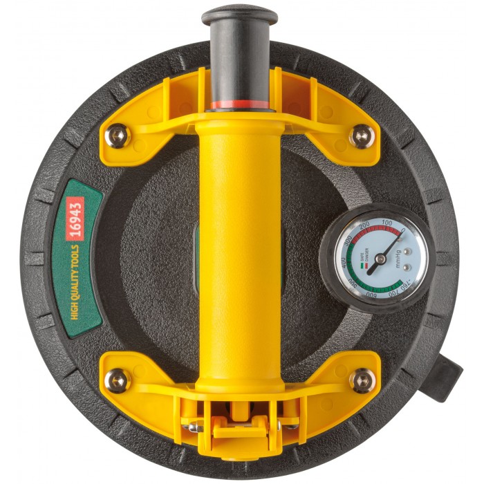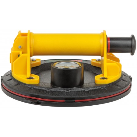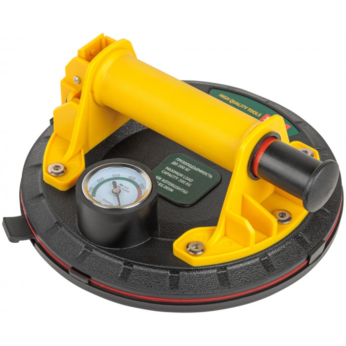 Профи. Усиленный. С ручной помпой для откачки воздуха и кнопкой быстрого сброса давления. Встроенный вакуумный манометр показывает величину разряженного воздуха (вакуума) под присоской. Для переноски и монтажа стекол, глазурованной кафельной плитки и пластика. Для гладких поверхностей. Перед применением поверхность поднимаемого изделия должна быть обезжиренной, чистой и сухой. Максимальная грузоподъемность 200 кг. Рабочая температура от +10 °С до +35 °С. Материал: корпус из усиленного нейлона, резиновая подошва, пластиковая защитная крышка. Упаковка: пластиковый кейс.