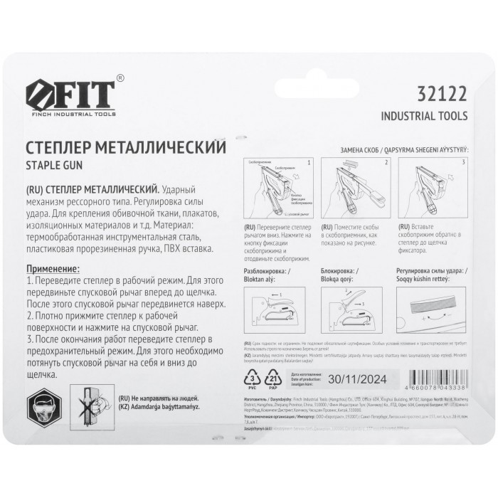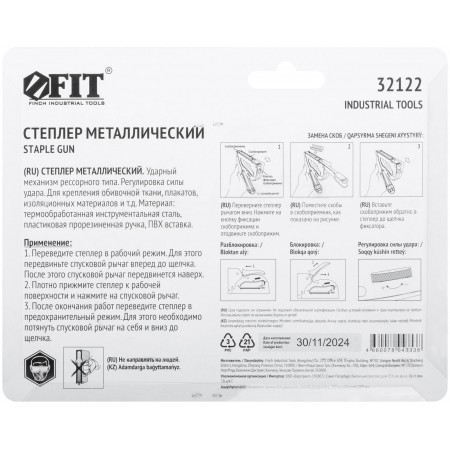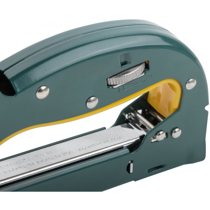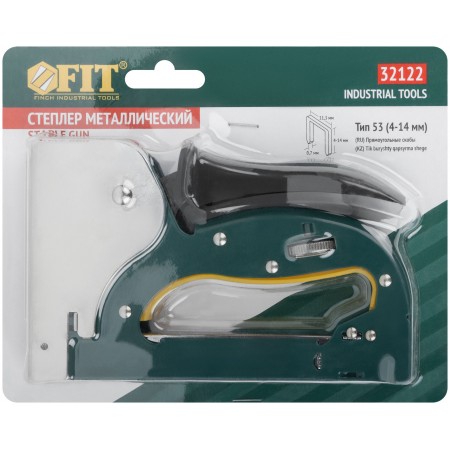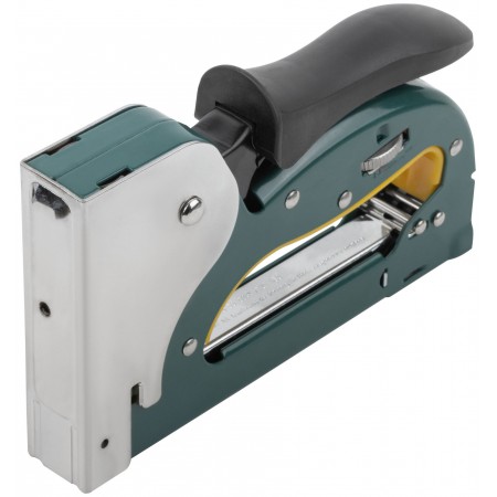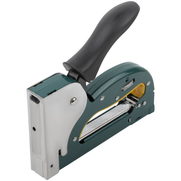 ''Профи''. Для скоб ''Тип 53''. Ударный механизм рессорного типа. Регулировка силы удара. Для закрепления обивки мебели, укрепления плакатов, закрепления проволочной сетки и строительства теплиц. Используется со скобами 31304-31314, 31404-31414, 31361-31365. Материал: инструментальная сталь, пластиковая прорезиненная ручка, ПВХ вставка. Упаковка: блистер.