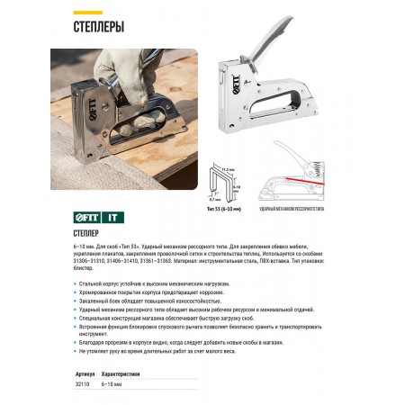 Степлер для узких скоб "тип 53" 6-10 мм, рессорный механизм, металлический корпус (32110)