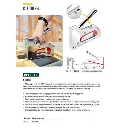 Степлер для узких скоб "тип 53F" 4-14 мм, рессорный механизм, 2-х позиционная регулировка силы удара, металлический корпус (32162)